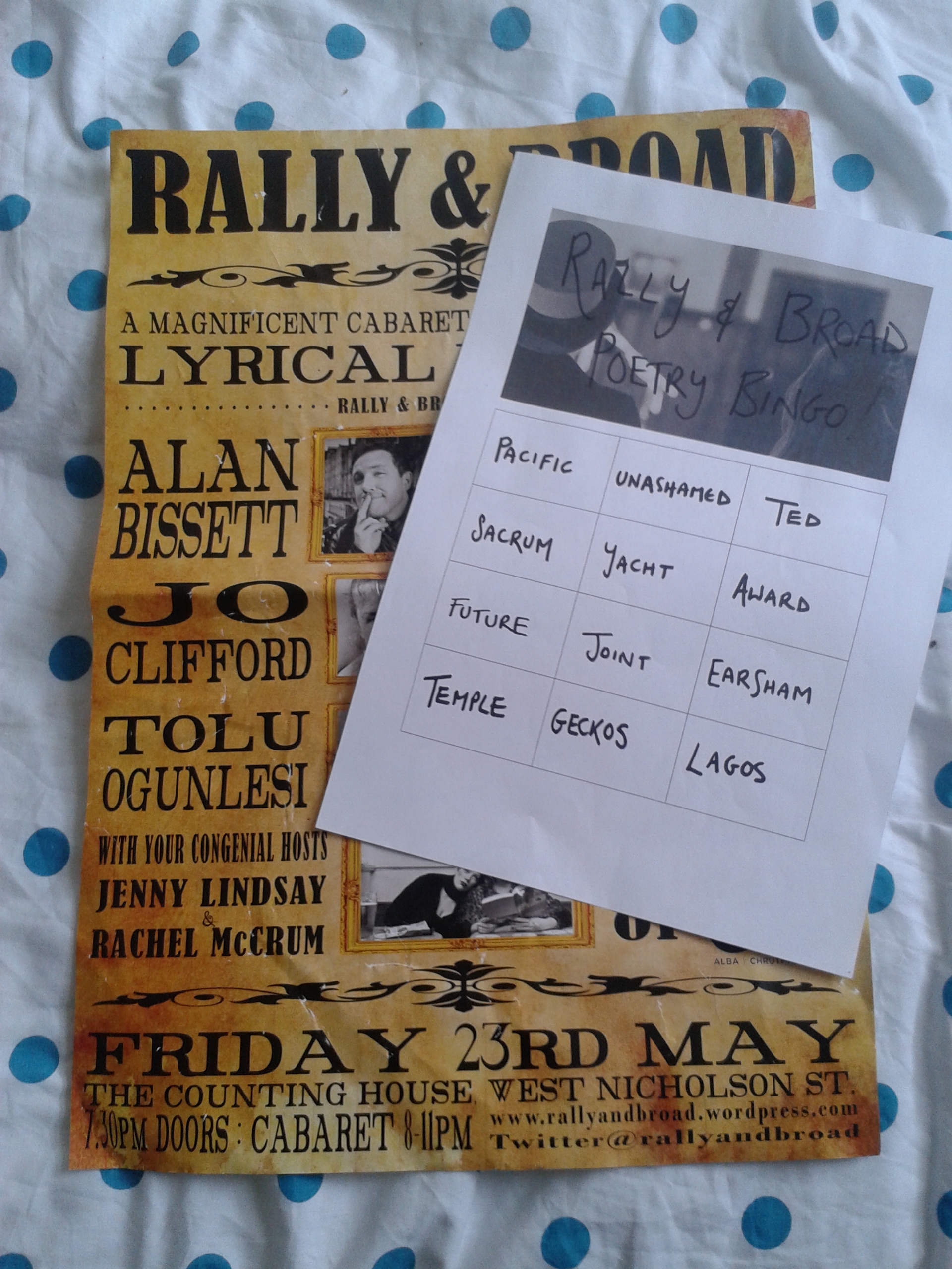 On Friday 23rd May, I had the privilege to see Rally & Broad, Luke Wright, Lake Montgomery and Alan Bissett for the second time, plus others for the first time. At the event, the organisers ran a Poetry Bingo competition, encouraging the audience to circle off twelve words as they heard them in the show. In addition, there was a challenge to use these twelve words in an original poem, and the winner would receive a ticket to the last show of the season. I’m pleased to report I was one of three winners, and my effort is below.Note that the last four lines are slightly incorrect because my handwriting was terrible, but I actually quite like the published version. Those few words lend it a different tone. The correct words are: