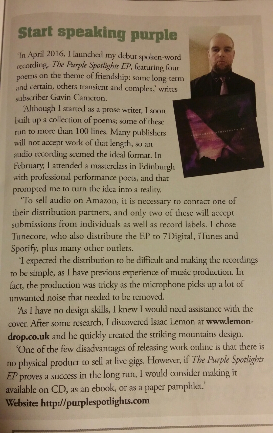 I’m so far behind with my reading that a friend actually pointed this out to me before I saw it. The Purple Spotlights EP, self-released in April, has been featured in Writing Magazine. It’s available from Amazon, iTunes, Spotify, plus many other outlets.