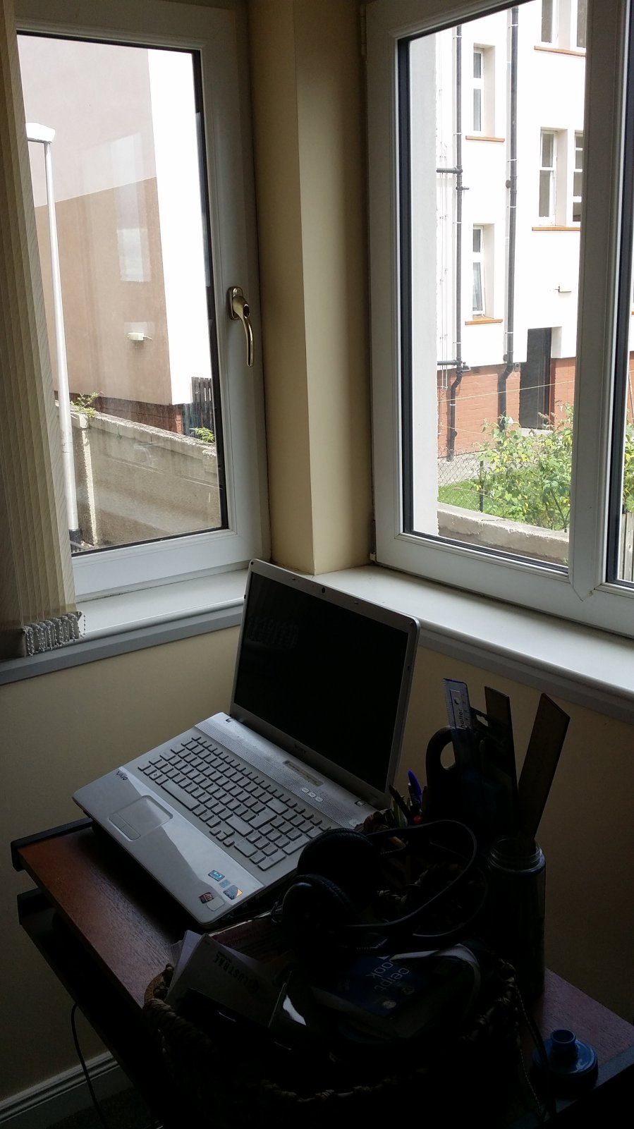 This first one is my writing area. There are better views from other windows, but it is a great place to stand and observe people and traffic. There is a seat in the room, but it’s not in front of the PC. I prefer to stand while I write.